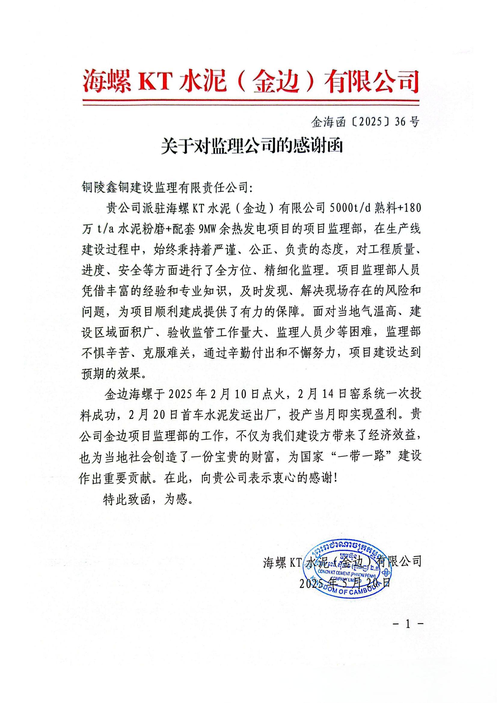 海螺KT水泥(金邊)有限公司特發(fā)感謝函,感謝公司在金邊海螺項(xiàng)目合作過程中的辛勤付出,對項(xiàng)目監(jiān)理部展現(xiàn)出的精湛業(yè)務(wù)能力和周到服務(wù)態(tài)度表示高度肯定。該項(xiàng)目的成功建成,彰顯了公司在海外項(xiàng)目監(jiān)理工作中的專業(yè)與擔(dān)當(dāng),未來,公司將繼續(xù)開拓外部市場,加強(qiáng)國際合作,為“一帶一路”建設(shè)貢獻(xiàn)更多力量。